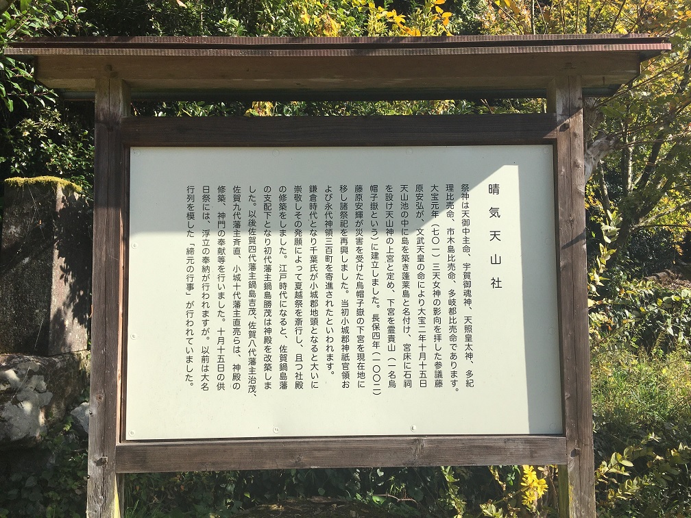 祭神は 天御中主命、宇賀御魂神、天照皇太神、多紀理比売命、市木島比売命 、多岐都比売命 であります。大宝元年(701)三天女神の影向を拝した参議藤原安弘が、文武天皇の命により大宝二年十月十五日天山池の中に島を築き蓬莱島と名付け、宮床に石祠を設け天山神の上宮と定め、下宮を霊貴山(一名烏帽子嶽という)に建立しました。長保四年(1002)藤原安輝が災害を受けた烏帽子嶽の下宮を現在地に移し諸祭祀を再興しました。当初小城郡神祇官領および永代神領三百町を寄進されたといわれます。鎌倉時代となり千葉氏が小城郡地頭となると大いに崇敬しその発願によって夏越祭を斎行し、且つ社殿の修築をしました。江戸時代になると、佐賀鍋島藩の支配下となり初代藩主鍋島勝茂は神殿を改築しました。以後佐賀四代藩主鍋島吉茂、佐賀八代藩主治茂、佐賀九代藩主斉直、小城十代藩主直亮らは、神殿の修築、審門の奉献等を行いました。十月十五日の供日祭には、浮立の奉納が行われますが。以前は大名行列を模した「締元の行事」が行われていました